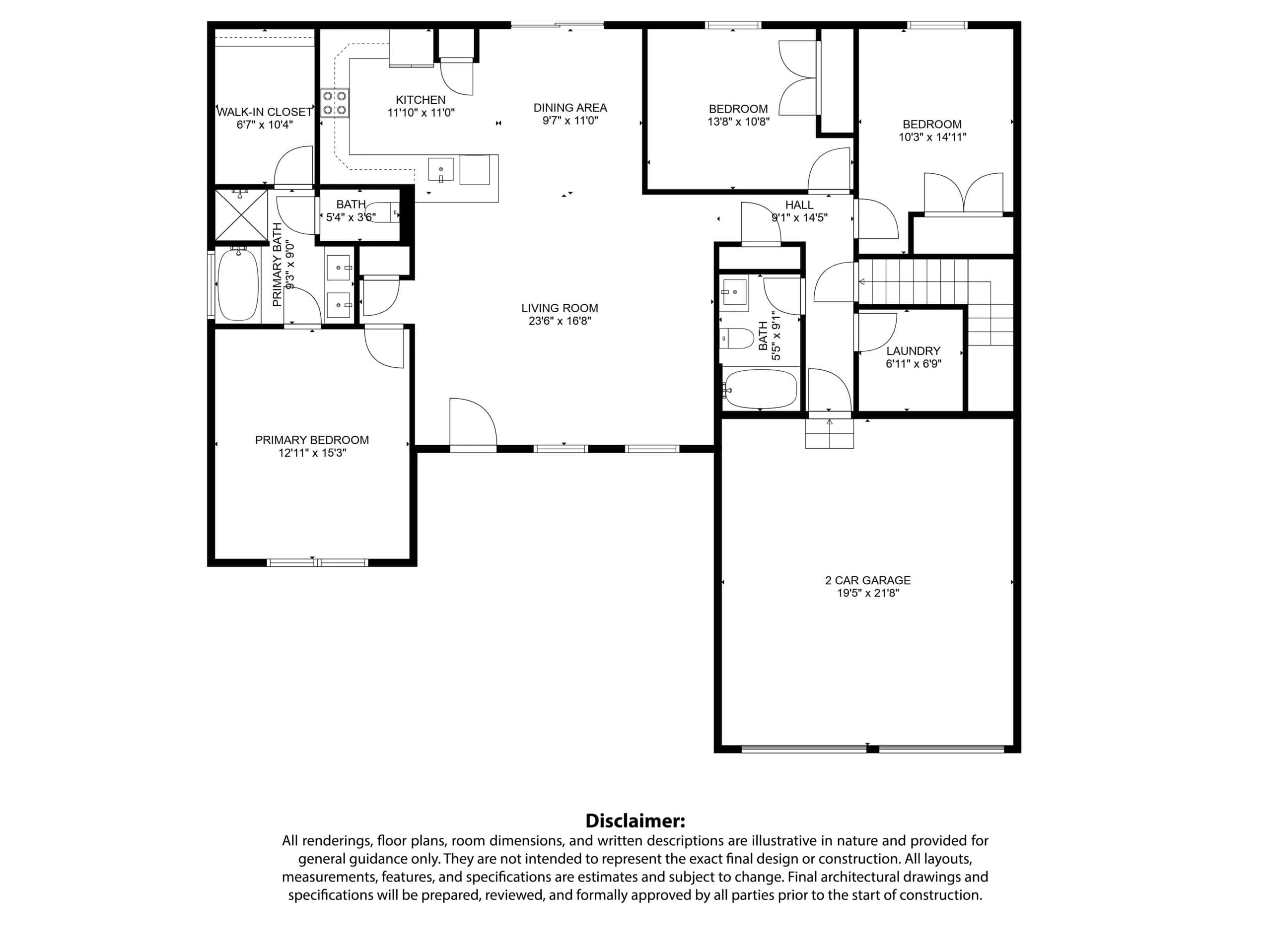The primary suite is privately situated on its own side of the home, offering a serene bedroom, an expansive walk-in closet, and a spa-inspired bath with dual sinks, a soaking tub, and a separate shower. Across the home, two additional bedrooms and a full bath provide flexible space for family, guests, or a dedicated home office. A nearby laundry room and direct access to the attached two-car garage enhance everyday living.