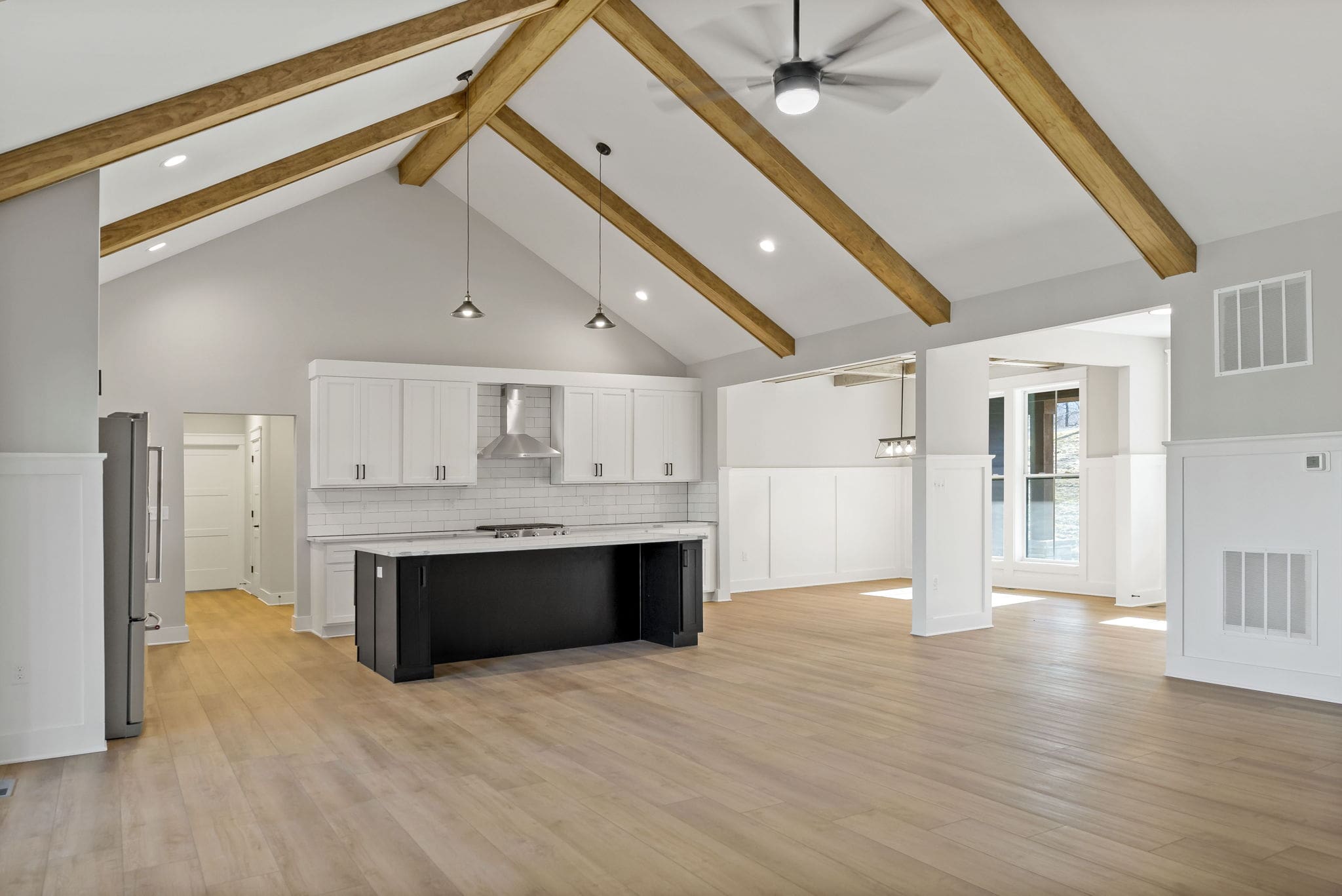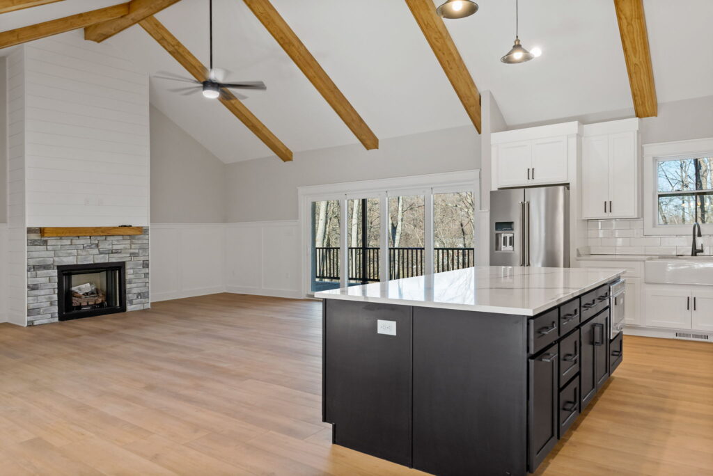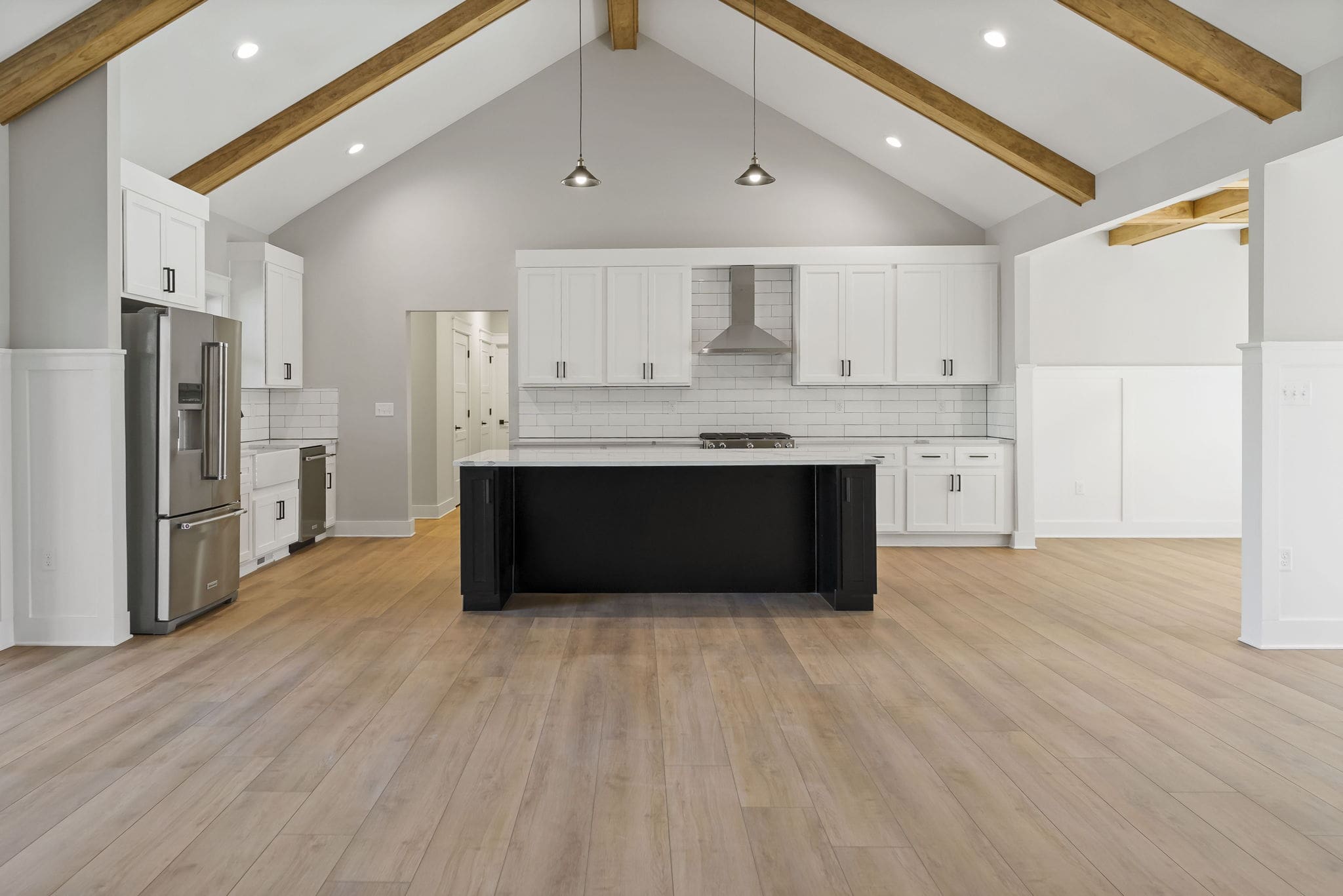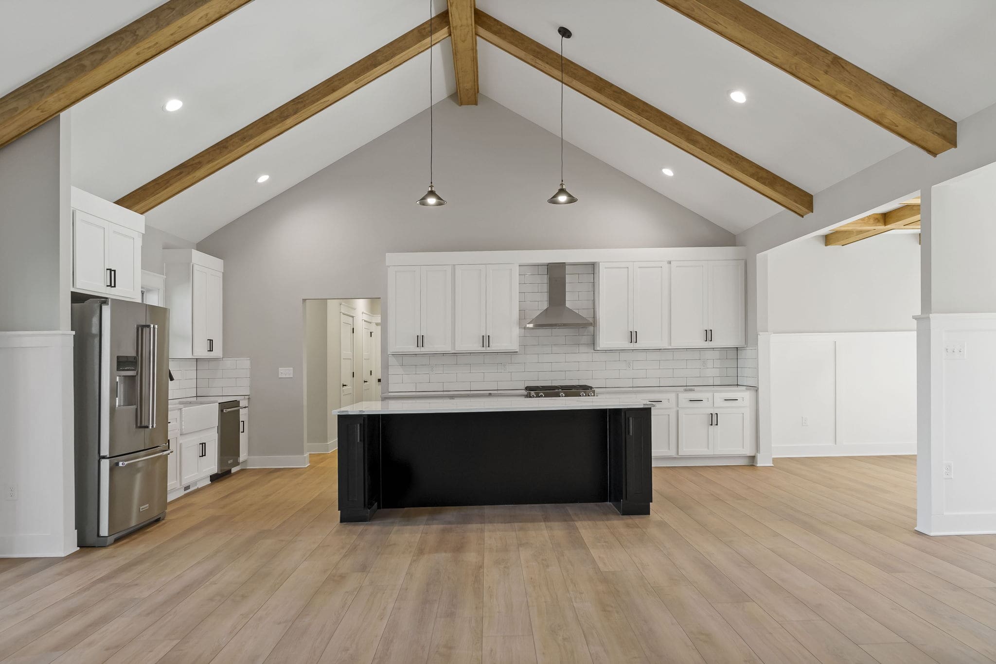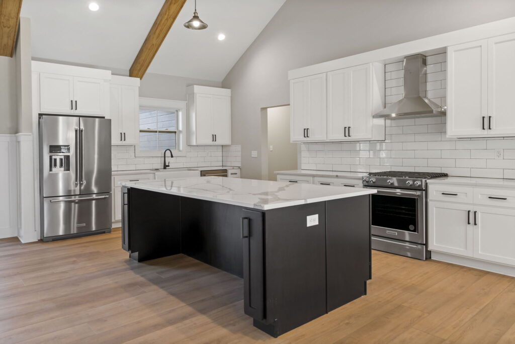 Enter through a gracious foyer into a formal living room that transitions into the heart of the home: an open kitchen, dining and great room arrangement where vaulted ceilings and wide-open sightlines create both presence and comfort. The kitchen features a large island, ample cabinetry, and a layout that invites both daily ease and entertaining grandeur. The primary suite is a refined retreat with ample space, a walk-in closet, and a luxurious en-suite bath with dual vanities and a walk-in shower.